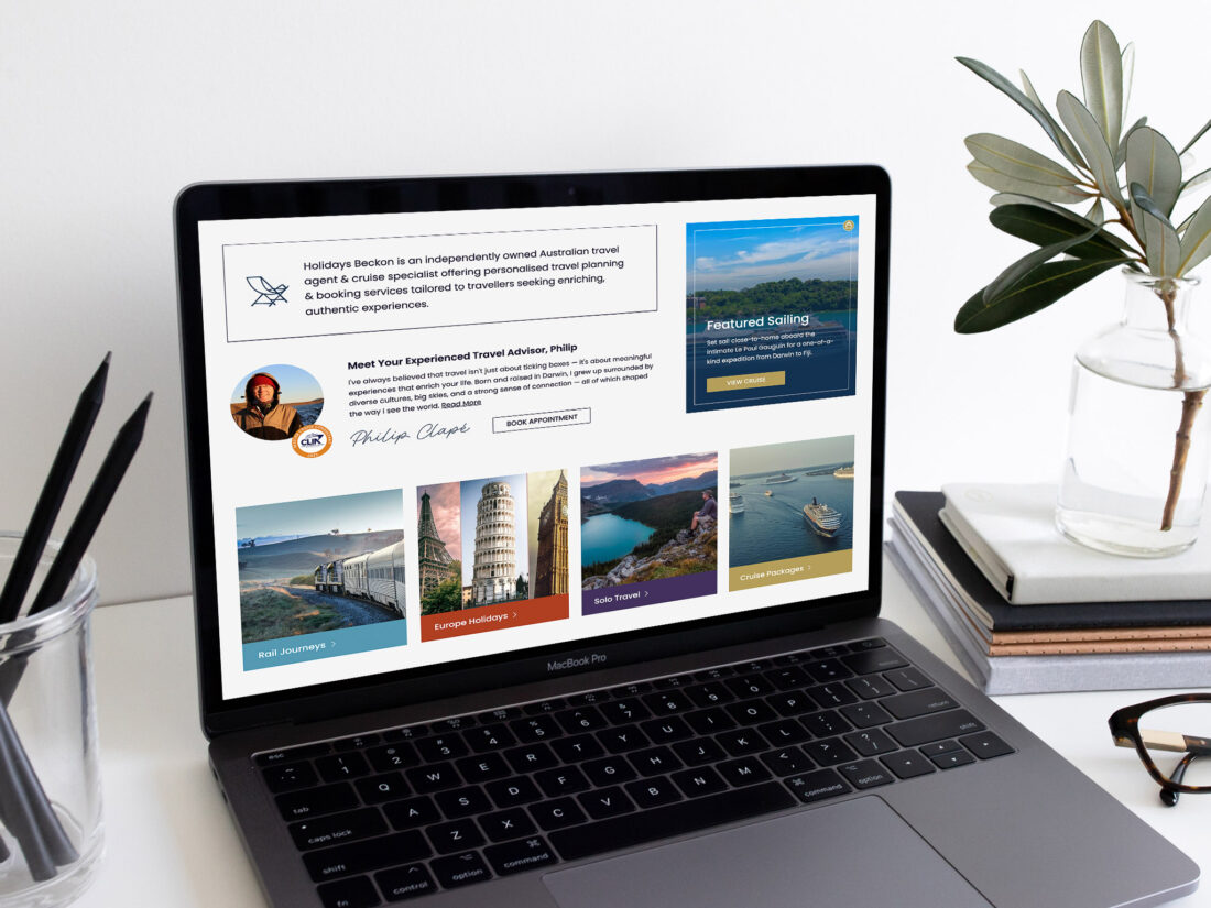 Travel Agent Website: Holidays Beckon, Queensland HomePortfolioTravel Agent Website: Holidays Beckon, Queensland Travel Agent Website: Holidays Beckon, Queensland Visit holidaysbeckon.com.au Need a website for your Tourism Business? Learn how we can help Back to Portfolio HomePortfolioTravel Agent Website: Holidays Beckon, Queensland